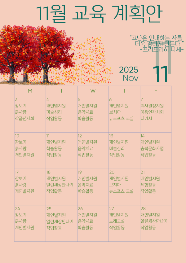 다모아주간보호센터 11월 교육 계획안 페이지 정보 작성일 : 25-11-03 19:30 조회 : 32회 관련링크 본문 다모아주간보호센터 11월 교육 계획안 입니다!! 이전글 다음글 목록