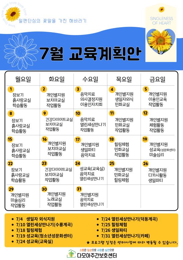 * 7월 10일, 24일, 31일은 열린세상 만나기 프로그램 진행 예정입니다.