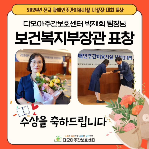 다모아주간보호센터 박재희 팀장님께서 보건복지부장관 표창을 수상하셨습니다.