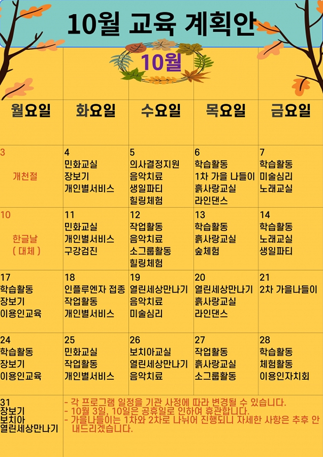 10월 다모아 주간보호센터 교육 계획안 페이지 정보 작성일 : 22-10-04 17:56 조회 : 567회 관련링크 본문 10월 다모아 주간보호센터 교육 프로그램 계획안을 올립니다. 이전글 다음글 목록