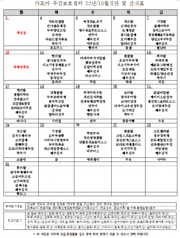 10월 다모아 주간보호센터 식단 및 간식표