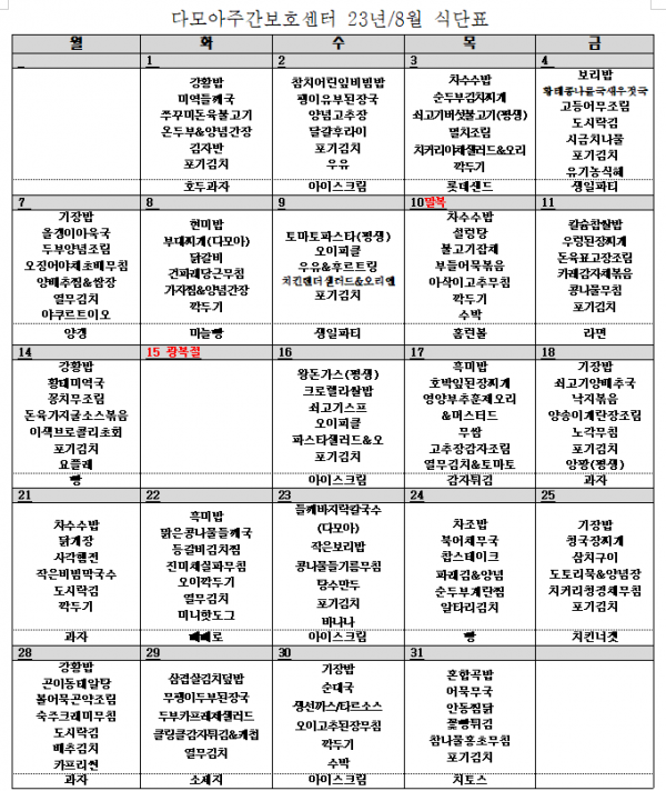 2023년 8월 식단표 및 간식표 입니다. 페이지 정보 작성일 : 23-08-01 12:34 조회 : 381회 관련링크 본문 2023년 8월 식단표 및 간식표 입니다. 이전글 다음글 목록