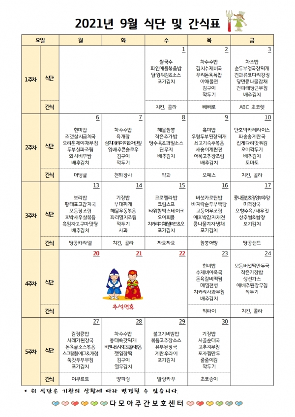 2021년 9월 식단 및 간식표입니다.
