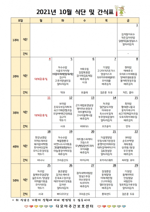 2021년 10월 식단 및 간식표입니다.