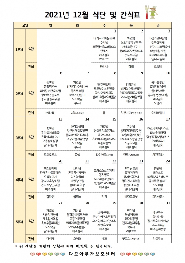 2021년 12월 식단 및 간식표입니다.
