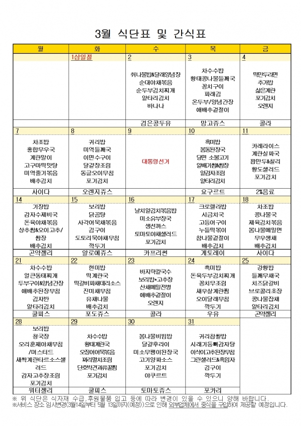 2022년 3월 식단표 및 간식표 입니다. 페이지 정보 작성일 : 22-02-28 13:11 조회 : 570회 관련링크 본문 2022년 3월 식단표 및 간식표 입니다. 이전글 다음글 목록