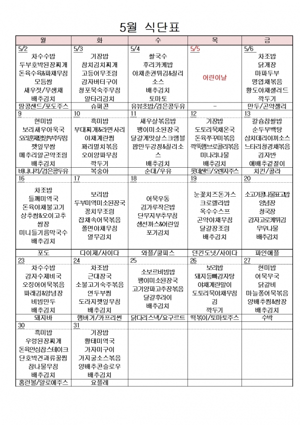 2022년 5월 식단표 및 간식표입니다. 페이지 정보 작성일 : 22-05-06 17:45 조회 : 531회 관련링크 본문 2022년 5월 식단표 및 간식표입니다. 이전글 다음글 목록