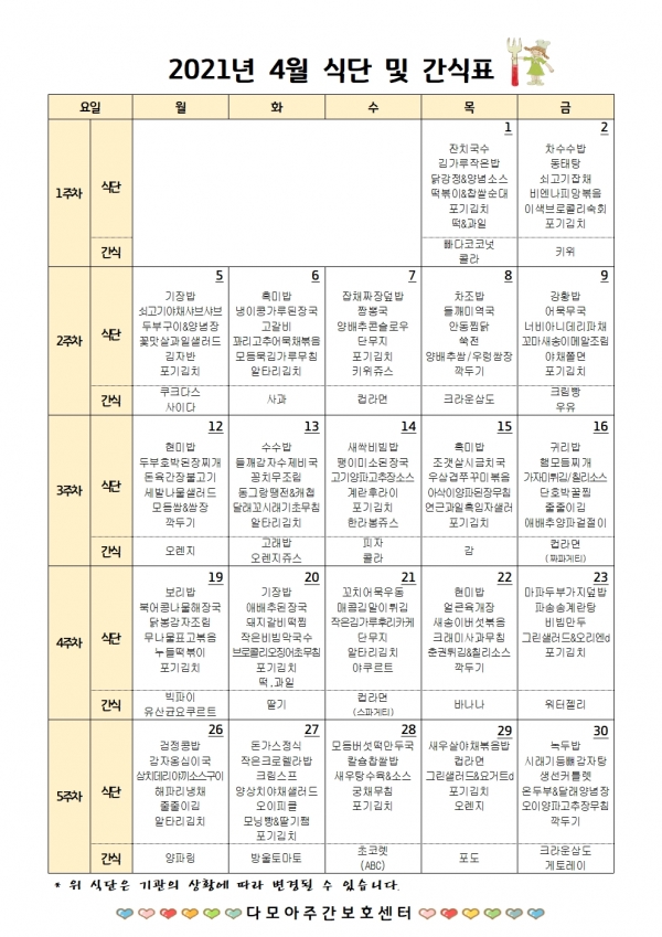 2021년 4월 식단 및 간식표 입니다 페이지 정보 작성일 : 21-05-02 14:51 조회 : 849회 관련링크 본문 4월에도 맛있는 간식과 영양 높은 식사를 준비하였습니다. 이전글 다음글 목록