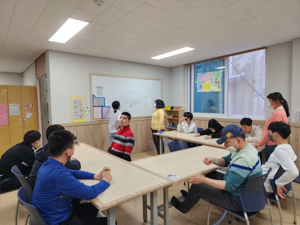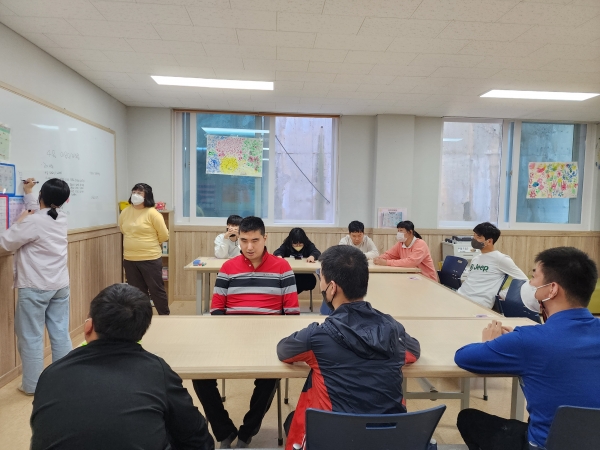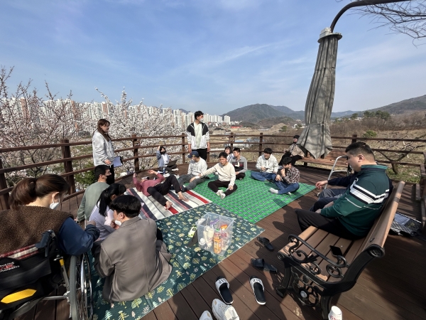 교육실 내부에서만 진행하던 이용인자치회를 야외에서 진행했습니다.