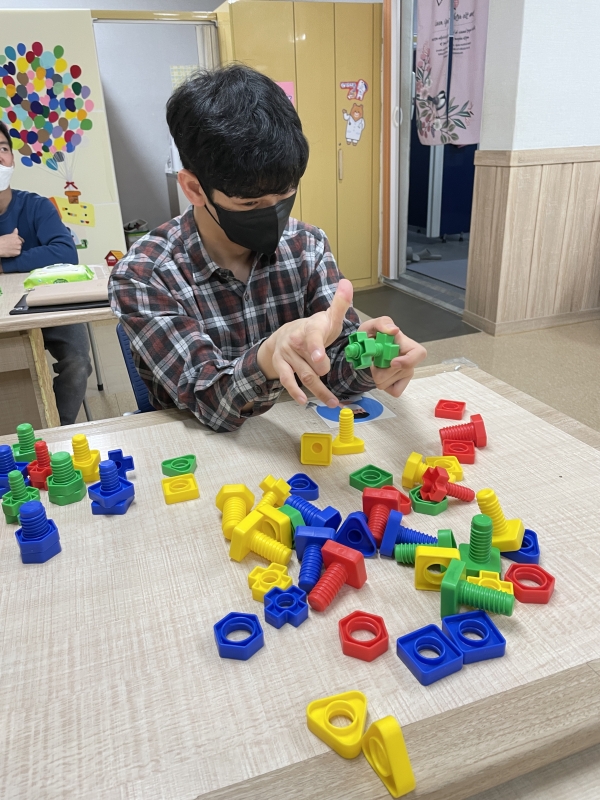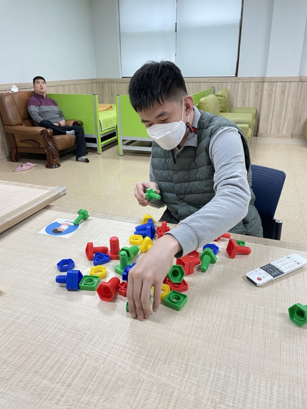 임가공작업에 참여하기 전, 작업훈련으로 눈과 손의 협응능력을 훈련하고 있습니다.