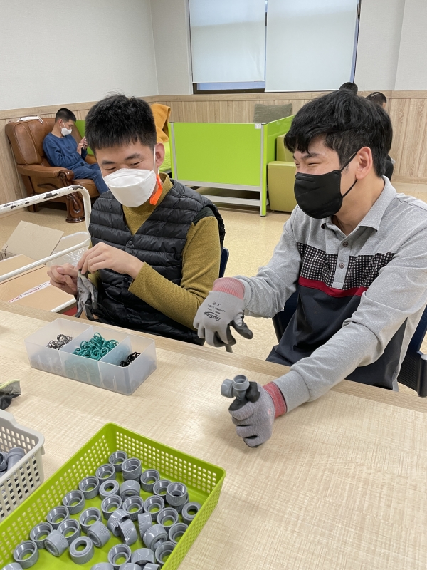 부품을 조립하고 뚜껑을 돌려 닫는 작업으로써, 이용인이 쉽게 따라할 수 있도록 지원하고 있습니다.