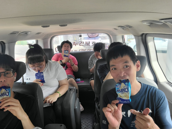지역 명소로 차량으로 이동하면서 편의점에 들려 사온 주전부리 입에 물고 다 같이 찰칵!^^